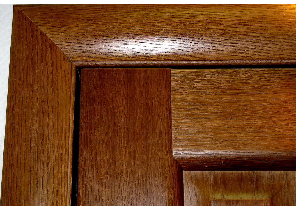 Установка наличников с угловым стыком применяется при выборе планок из массива дерева, поскольку, при изменении сезонной влажности в помещении соединение «на ус» будет периодически раскрывать наружную/внутреннюю щель. Эта особенность линейного расширения древесины учитывалась мастерами прошлых лет в типовых квартирах, поэтому, большинство старых наличников сопрягается именно этим способом. Преимущества нашей компании